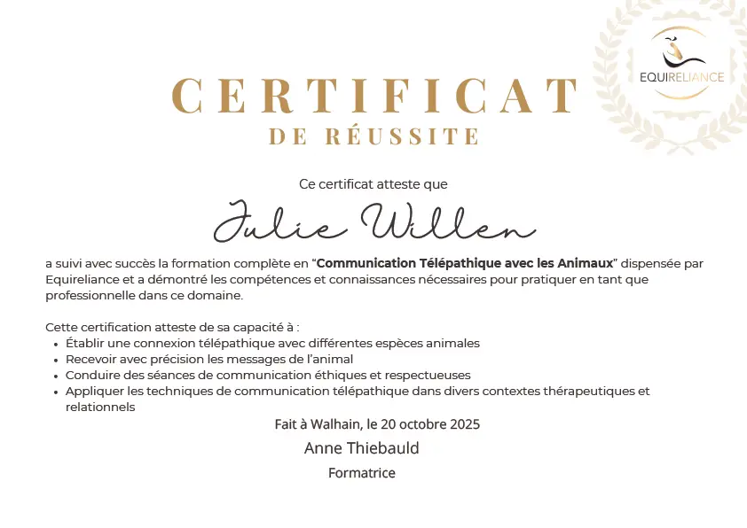 C’est avec un grand honneur et une profonde fierté que je certifie officiellement Julie Willen en tant que Communicatrice Animale Professionnelle.
